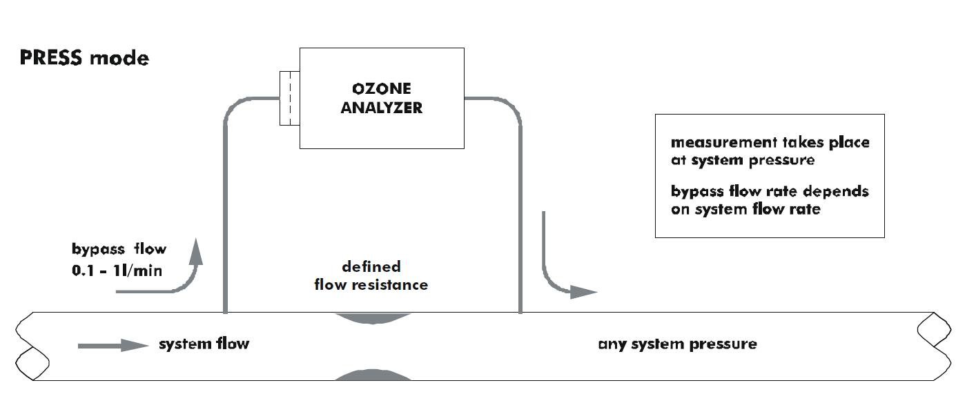 當(dāng)系統流量較大時,e。G在每分鍾1到10升之間, 很好的解決方案是将臭氧分析儀在旁路連接到臭氧線中的一個小流阻。這個流動(dòng)阻力下的壓降應該在幾毫升棒的順序,以允許足夠的樣品氣體流過分析儀。
