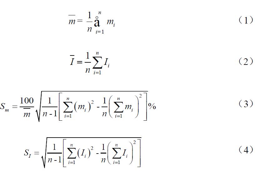 多點(diǎn)校準的平均斜率與平均截距分别按公式(1)和公式(2)進行計算;多點(diǎn)校準斜率的相對(duì)标準偏差和截距的标準偏差分别按公式(3)和公式(4)進行計算。