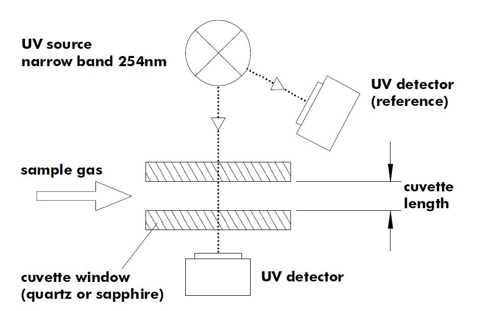 紫外線輻射由兩個不同的紫外線探測(cè)器測(cè)量。一個探測(cè)器稱爲參(cān)考探測(cè)器,測(cè)量通過比管前的輻射,另一個探測(cè)器測(cè)量通過比管後的輻射,以及通過比管中包含的樣品氣體的輻射。